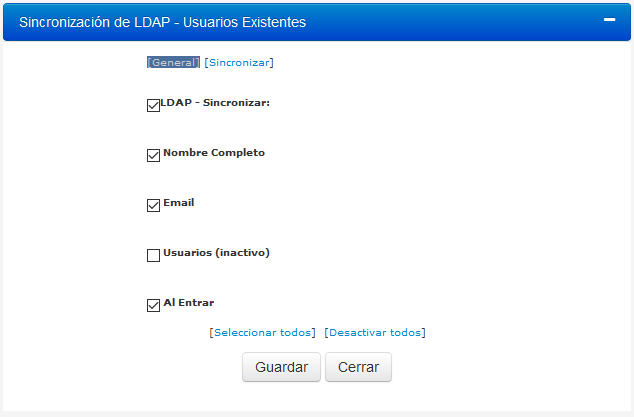 4.En el cuadro de diálogo de sincronización que aparecerá haga clic en la casilla de verificación de LDAP – Sincronice y haga clic en las casillas de verificación para las opciones que se quieren sincronizar (para seleccionar todos los campos, haga clic en Seleccionar todos). Para borrar todos los campos (Si verifico), haga clic en Resetear todos.
