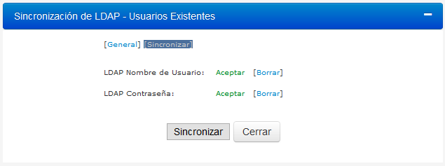 7.Para sincronizar manualmente LDAP registre la información del usuario con DynamicPolicy™, posicionándose en Sincronizar.