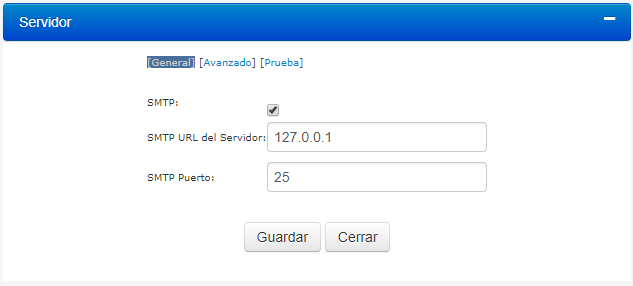 2.Debajo de Opciones del Servidor, seleccione Email (SMTP). La ventana del servidor será desplegada en la pantalla: