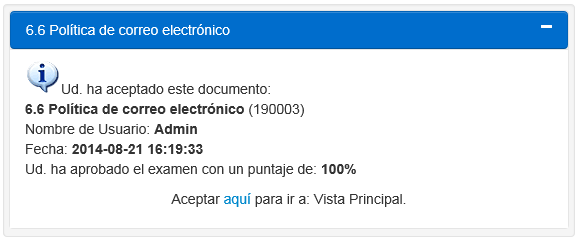 Nota: Puede presentar un examen las veces que sea necesario hasta aprobarlo. No puede aceptar una política hasta aprobar el examen. Después de aprobarlo, no puede volver a hacerlo. Su número de prueba es enviado y reportado en el reporte administrativo. |