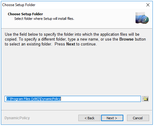 5.Elija la carpeta de configuración donde desea instalar DynamicPolicy™. Una vez que se ha seleccionado la carpeta apropiada, presione Next.